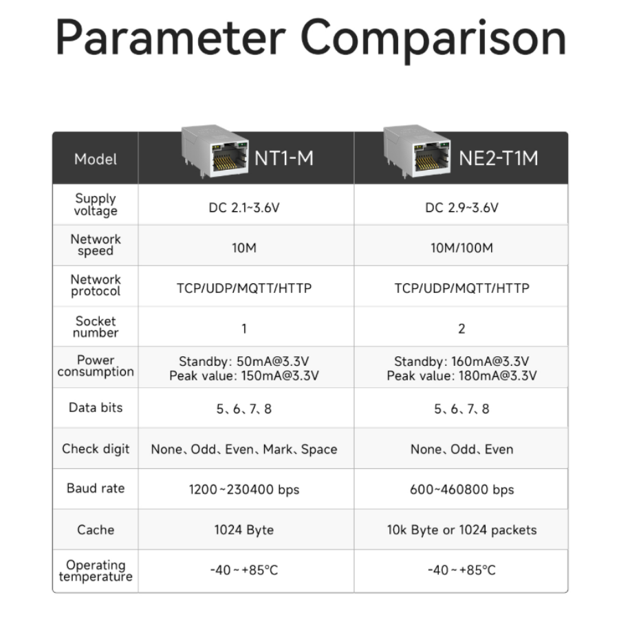 NT1-M Seri - Ethernet Pin Modülü, TTL seri port verisi ⇌ Ethernet verisi iletimini gerçekleştiren bir Ethernet modülüdür (aynı zamanda "süper ağ portu" olarak da bilinir). Gövdesi, mantar önleyici, nem önleyici ve tuz püskürtmesine karşı koruyucu olmak üzere üç katmanlı kaplamaya sahiptir. Ürün, RJ45 arayüzü ve tam ağ portu paketiyle birlikte gelir. Çeşitli TTL seviyeli seri cihazların ve MCU'ların ağ işlevlerini karşılayabilir. TCP/UDP, MQTT, HTTP, IPV4, DHCP, DNS DC 2.1~3.6V